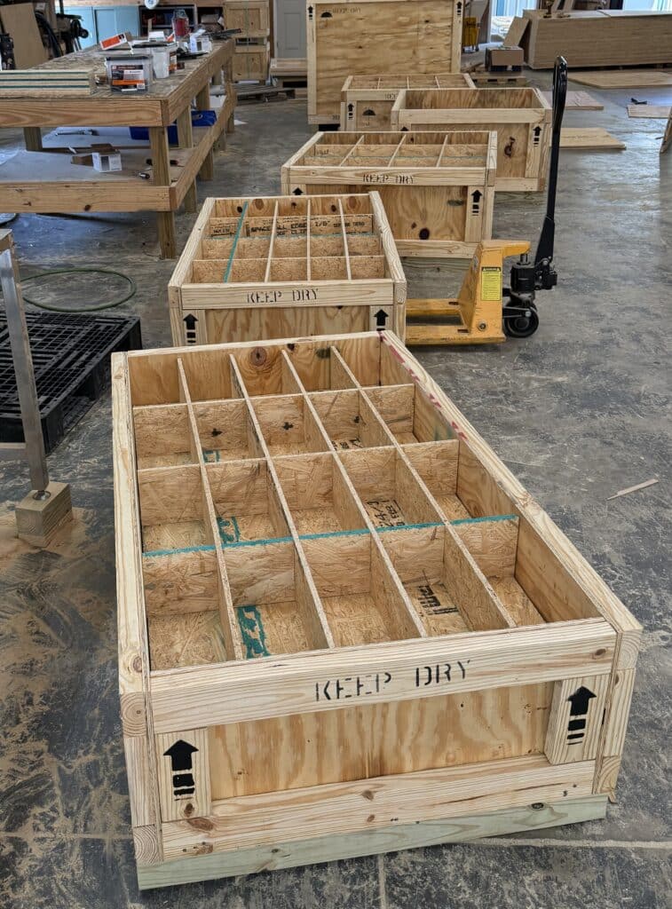 Specialized of shipping containers featuring multiple compartments or "cubbies," designed to securely transport a variety of items separately within a single crate, optimizing organization and protection.